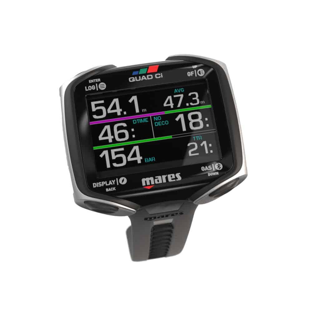 Scopri tutte le funzioni del computer per immersioni Mares QUAD Ci. Personalizzabile con l'algoritmo Bühlmann ZH-L16C, il QUAD Ci permette di impostare gradient factors personalizzati, garantendo un'immersione sicura e adatta alle tue preferenze. Con modalità versatili che comprendono aria, nitrox e trimix, abbinate a un display MIP a 8 colori ad alta risoluzione, questo computer subacqueo fornisce informazioni complete a colpo d'occhio. La bussola digitale integrata, il cronometro e la possibilità di integrare i dati della bombola tramite il trasmettitore opzionale (fino a cinque trasmettitori) migliorano le capacità di navigazione e monitoraggio. Il computer per immersioni con decompressione, la capacità del diario di bordo di 100 ore e il sistema di gestione intelligente della batteria offrono 20 ore di immersione per carica completa. Rimani connesso tramite Bluetooth, accedi alle informazioni in tempo reale sulle immersioni e aggiorna comodamente il firmware tramite l'app Mares. Le funzioni di sicurezza, come il TTR e l'allarme di decompressione, rendono questo computer per immersioni un compagno affidabile per le esplorazioni subacquee.