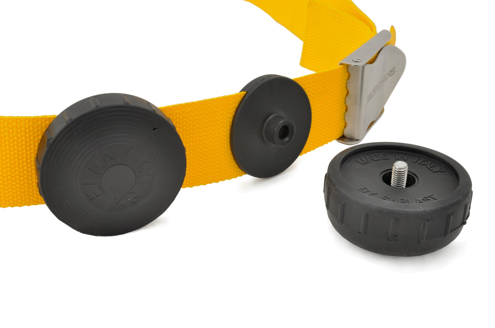 Il fissaggio in cintura dei piombi Eleny avviene infilando il supporto in nylon in dotazione (che può essere spostato nella posizione preferita in modo facile e veloce) e avvitandogli direttamente il piombo. La vite inserita nel piombo stesso ne bloccherà lo scorrimento.