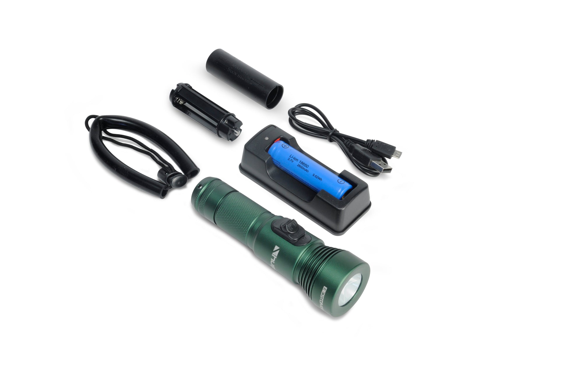 E’ dotata di batteria ricaricabile 18650, caricabatterie, cavetto USB.