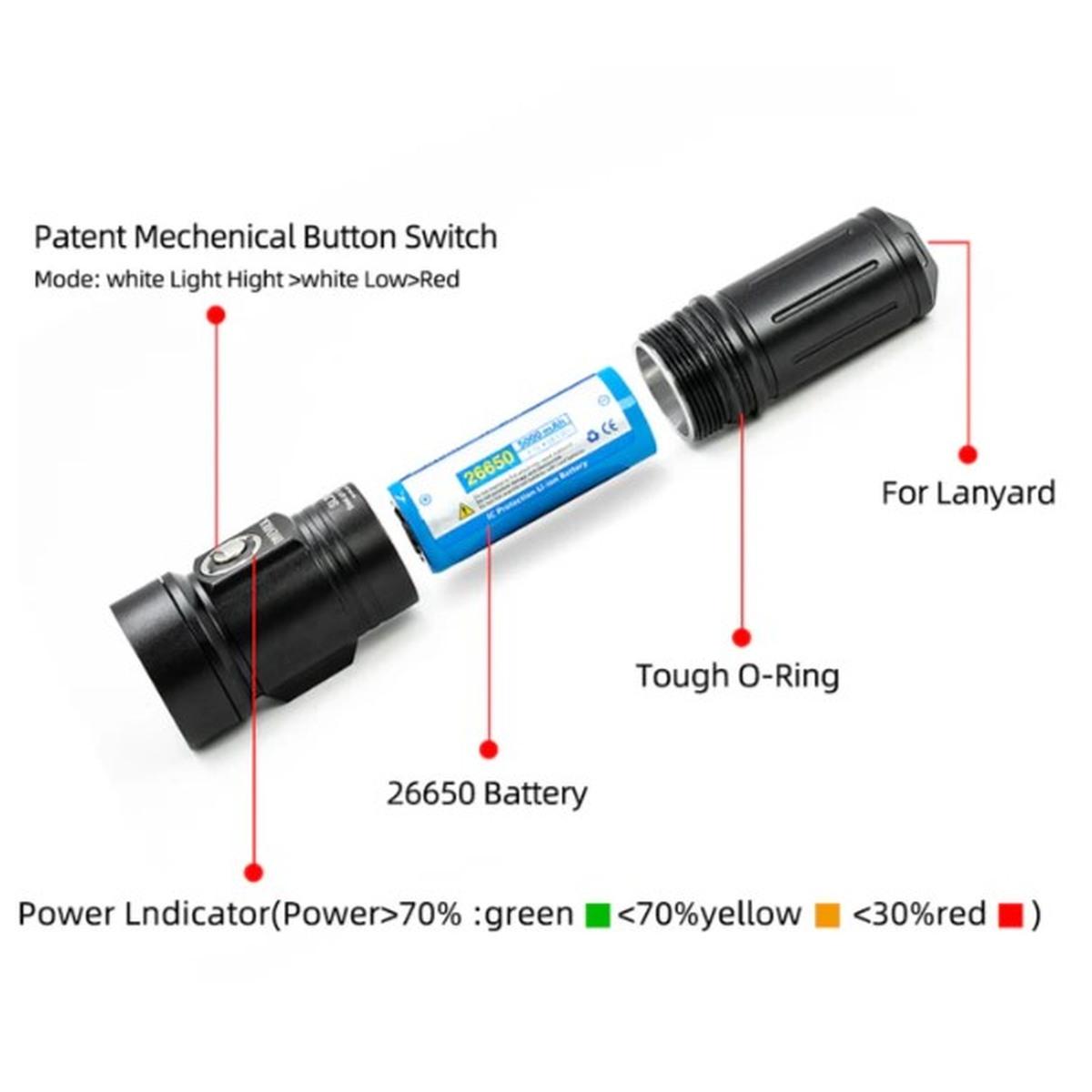 La modalità ad alta potenza è ideale per catturare filmati vividi e dettagliati, mentre la modalità a bassa potenza prolunga il tempo di immersione senza sacrificare la luminosità. È inclusa un’esclusiva funzione di luce rossa per disturbare al minimo la vita marina e mantenere i colori naturali della scena subacquea.